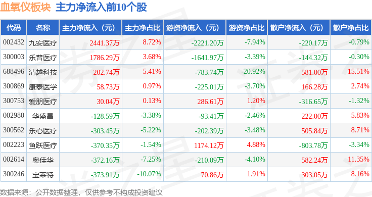 从资金流向上来看,当日血氧仪板块主力资金净流出2123.85万元,游资资金净流出2763.75万元,散户资金净流入4887.6万元。血氧仪板块个股资金流向见下表: