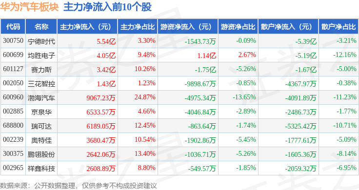 从资金流向上来看,当日华为汽车板块主力资金净流入5.22亿元,游资资金净流出2.33亿元,散户资金净流出2.89亿元。华为汽车板块个股资金流向见下表: