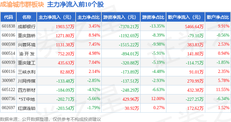 从资金流向上来看,当日成渝城市群板块主力资金净流出9492.71万元,游资资金净流出1.49亿元,散户资金净流入2.44亿元。成渝城市群板块个股资金流向见下表: