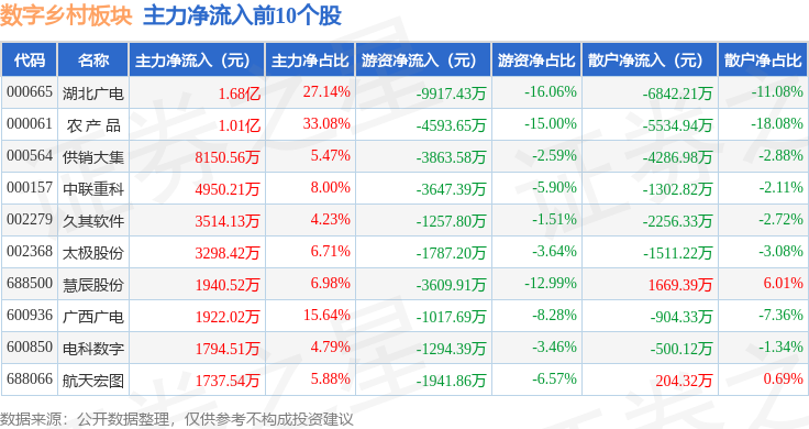 从资金流向上来看,当日数字乡村板块主力资金净流入5585.03万元,游资资金净流出5.94亿元,散户资金净流入5.38亿元。数字乡村板块个股资金流向见下表: