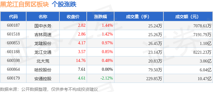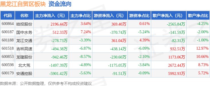 从资金流向上来看,当日黑龙江自贸区板块主力资金净流出6405.6万元,游资资金净流出1575.61万元,散户资金净流入7981.2万元。黑龙江自贸区板块个股资金流向见下表: