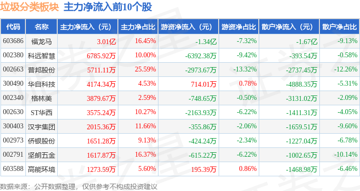 从资金流向上来看,当日垃圾分类板块主力资金净流入3.66亿元,游资资金净流出4.6亿元,散户资金净流入9484.74万元。垃圾分类板块个股资金流向见下表: