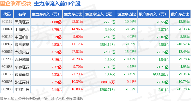从资金流向上来看,当日国企改革板块主力资金净流入26.09亿元,游资资金净流出51.96亿元,散户资金净流入25.87亿元。国企改革板块个股资金流向见下表: