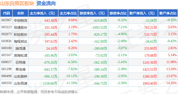 从资金流向上来看,当日山东自贸区板块主力资金净流出2691.4万元,游资资金净流出4836.89万元,散户资金净流入7528.29万元。山东自贸区板块个股资金流向见下表: