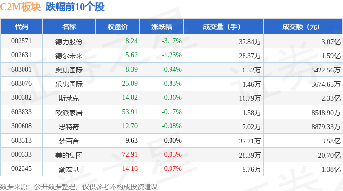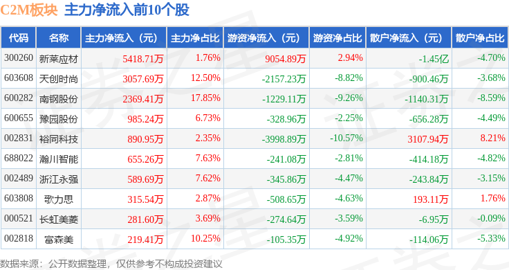 从资金流向上来看,当日C2M板块主力资金净流出1.01亿元,游资资金净流出565.54万元,散户资金净流入1.06亿元。C2M板块个股资金流向见下表: