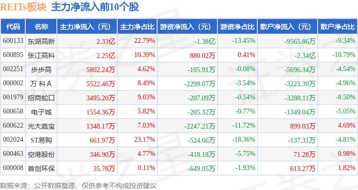 从资金流向上来看,当日REITs板块主力资金净流入5.55亿元,游资资金净流出2.46亿元,散户资金净流出3.09亿元。REITs板块个股资金流向见下表: