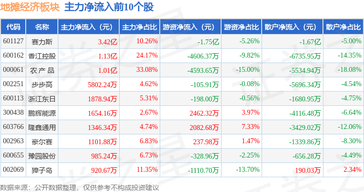 从资金流向上来看,当日地摊经济板块主力资金净流入5.39亿元,游资资金净流出2.56亿元,散户资金净流出2.83亿元。地摊经济板块个股资金流向见下表: