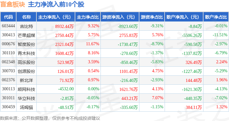 从资金流向上来看,当日盲盒板块主力资金净流入6638.54万元,游资资金净流出4733.82万元,散户资金净流出1904.71万元。盲盒板块个股资金流向见下表: