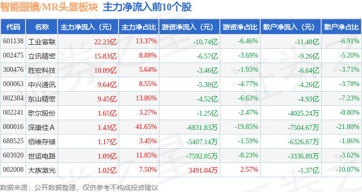 从资金流向上来看,当日智能眼镜/MR头显板块主力资金净流入68.44亿元,游资资金净流出37.52亿元,散户资金净流出30.91亿元。智能眼镜/MR头显板块个股资金流向见下表: