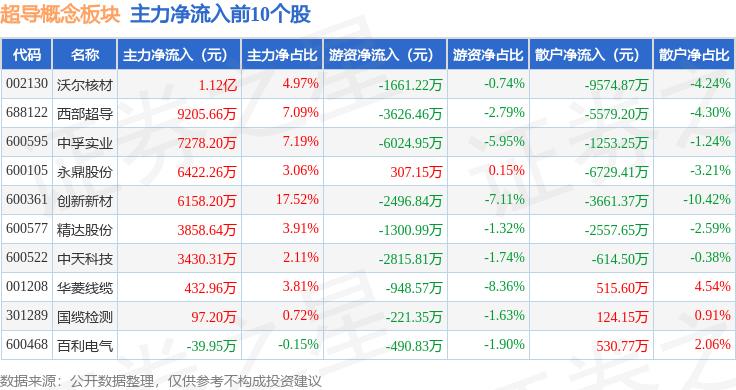 从资金流向上来看,当日超导概念板块主力资金净流入1.66亿元,游资资金净流出3.02亿元,散户资金净流入1.35亿元。超导概念板块个股资金流向见下表: