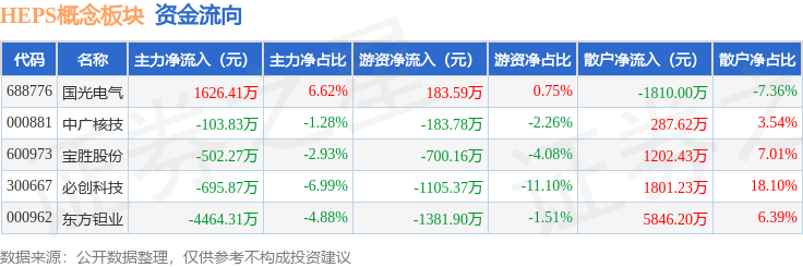 从资金流向上来看,当日HEPS概念板块主力资金净流出4139.87万元,游资资金净流出3187.61万元,散户资金净流入7327.48万元。HEPS概念板块个股资金流向见下表:
