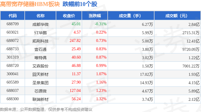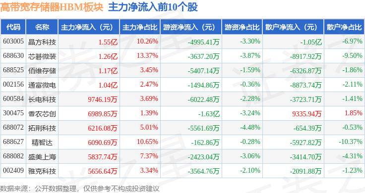从资金流向上来看,当日高带宽存储器HBM板块主力资金净流入9.16亿元,游资资金净流出6.1亿元,散户资金净流出3.05亿元。高带宽存储器HBM板块个股资金流向见下表: