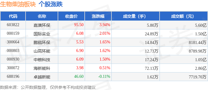 证券之星消息,10月21日生物柴油板块较上一交易日上涨1.54%,嘉澳环保领涨。当日上证指数报收于3916.33,上涨1.36%。深证成指报收于13077.32,上涨2.06%。生物柴油板块个股涨跌见下表: