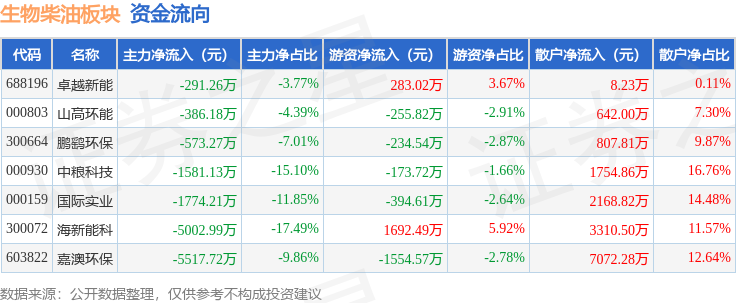 从资金流向上来看,当日生物柴油板块主力资金净流出1.51亿元,游资资金净流出637.74万元,散户资金净流入1.58亿元。生物柴油板块个股资金流向见下表: