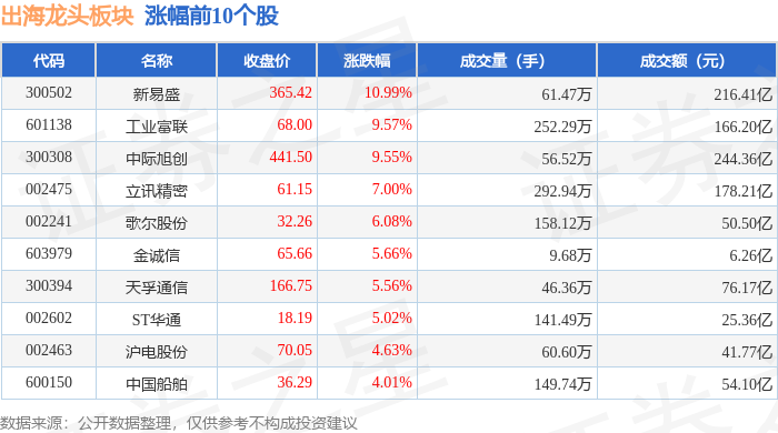 证券之星消息,10月21日出海龙头板块较上一交易日上涨3.73%,新易盛领涨。当日上证指数报收于3916.33,上涨1.36%。深证成指报收于13077.32,上涨2.06%。出海龙头板块个股涨跌见下表: