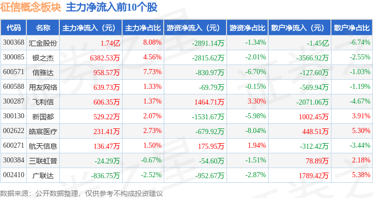 从资金流向上来看,当日征信概念板块主力资金净流入2.08亿元,游资资金净流出9760.25万元,散户资金净流出1.11亿元。征信概念板块个股资金流向见下表: