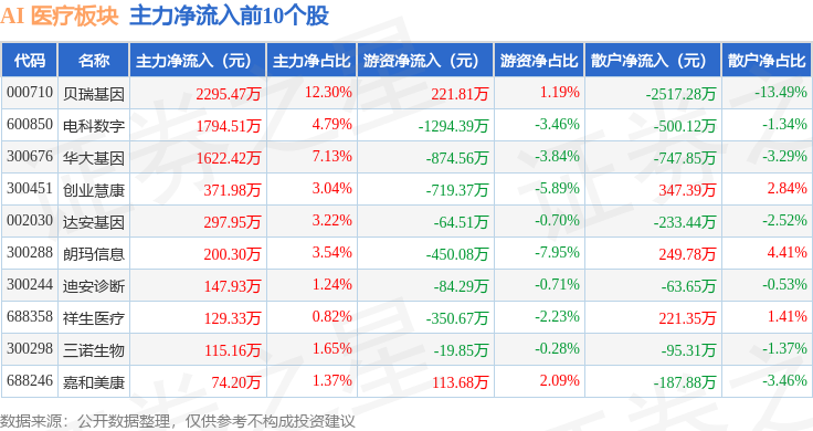 从资金流向上来看,当日AI 医疗板块主力资金净流出6697.02万元,游资资金净流出3346.61万元,散户资金净流入1.0亿元。AI 医疗板块个股资金流向见下表: