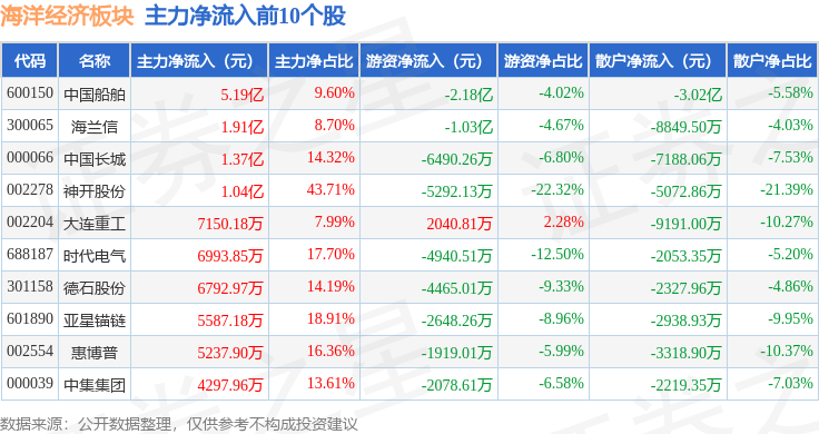 从资金流向上来看,当日海洋经济板块主力资金净流入8.89亿元,游资资金净流出5.13亿元,散户资金净流出3.76亿元。海洋经济板块个股资金流向见下表: