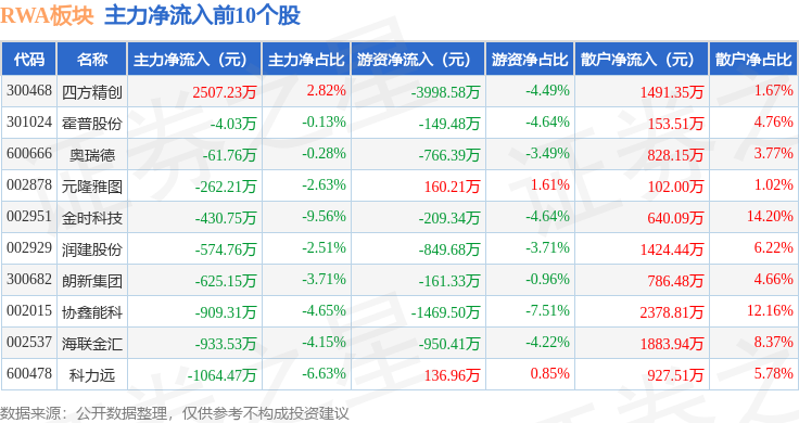从资金流向上来看,当日RWA板块主力资金净流出1.63亿元,游资资金净流出7229.79万元,散户资金净流入2.35亿元。RWA板块个股资金流向见下表:
