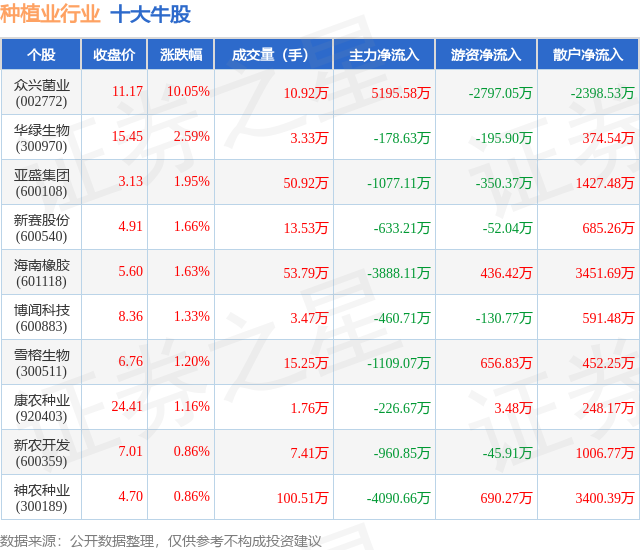 个股表现方面,种植业行业当日领涨股为众兴菌业(002772),该股当日报收11.17,上涨10.05%,成交量10.92万,主力资金净流入5195.58万元。华绿生物(300970)以上涨2.59%紧随其后,该股当日成交量3.33万,主力资金净流出178.63万元。除此之外,亚盛集团(600108)、新赛股份(600540)、海南橡胶(601118)均进入当日牛股之列。具体个股列表见下表: