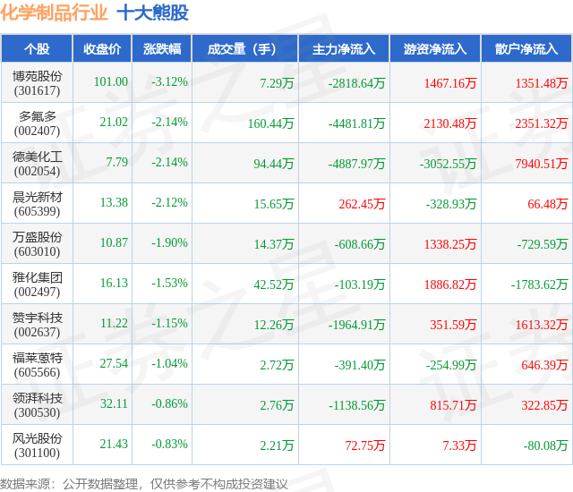 个股表现方面,化学制品行业当日领跌股为博苑股份(301617),该股当日报收101.0,下跌3.12%,成交量7.29万,主力资金净流出2818.64万元。多氟多(002407)以下跌2.14%紧随其后,该股当日成交量160.44万,主力资金净流出4481.81万元。除此之外,德美化工(002054)、晨光新材(605399)、万盛股份(603010)均进入当日熊股之列。具体个股列表见下表: