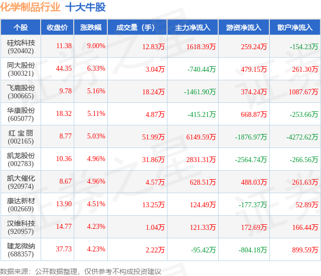个股表现方面,化学制品行业当日领涨股为硅烷科技(920402),该股当日报收11.38,上涨9.0%,成交量12.83万,主力资金净流入1618.39万元。同大股份(300321)以上涨6.33%紧随其后,该股当日成交量3.04万,主力资金净流出740.44万元。除此之外,飞鹿股份(300665)、华康股份(605077)、红 宝 丽(002165)均进入当日牛股之列。具体个股列表见下表: