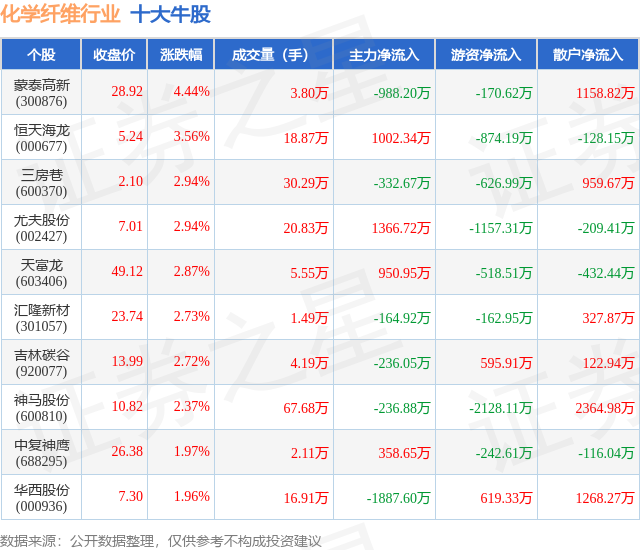 个股表现方面,化学纤维行业当日领涨股为蒙泰高新(300876),该股当日报收28.92,上涨4.44%,成交量3.8万,主力资金净流出988.2万元。恒天海龙(000677)以上涨3.56%紧随其后,该股当日成交量18.87万,主力资金净流入1002.34万元。除此之外,三房巷(600370)、尤夫股份(002427)、天富龙(603406)均进入当日牛股之列。具体个股列表见下表: