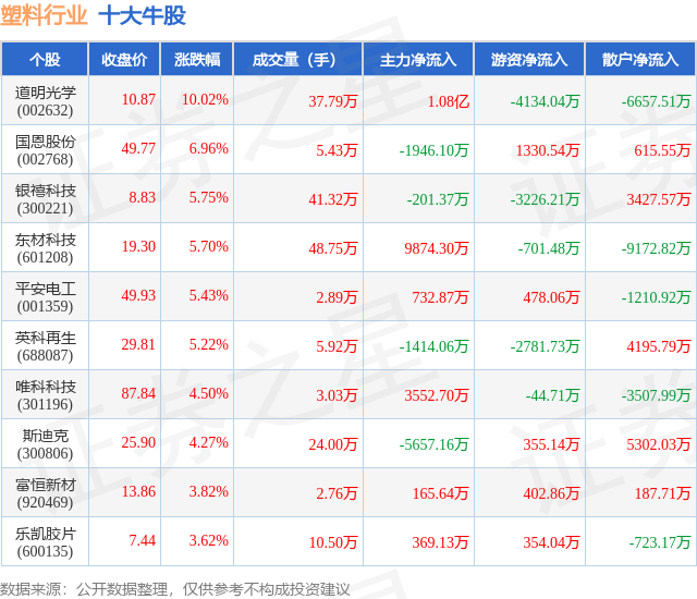 个股表现方面,塑料行业当日领涨股为道明光学(002632),该股当日报收10.87,上涨10.02%,成交量37.79万,主力资金净流入1.08亿元。国恩股份(002768)以上涨6.96%紧随其后,该股当日成交量5.43万,主力资金净流出1946.1万元。除此之外,银禧科技(300221)、东材科技(601208)、平安电工(001359)均进入当日牛股之列。具体个股列表见下表: