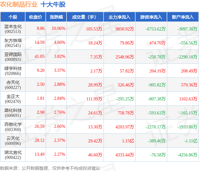 个股表现方面,农化制品行业当日领涨股为蓝丰生化(002513),该股当日报收8.86,上涨10.06%,成交量105.53万,主力资金净流入9850.92万元。东方铁塔(002545)以上涨4.66%紧随其后,该股当日成交量18.24万,主力资金净流入79.86万元。除此之外,亚钾国际(000893)、绿亨科技(920866)、赤天化(600227)均进入当日牛股之列。具体个股列表见下表:
