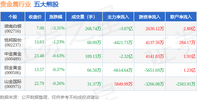 个股表现方面,贵金属行业当日领跌股为湖南白银(002716),该股当日报收7.0,下跌3.31%,成交量268.74万,主力资金净流出3.07亿元。恒邦股份(002237)以下跌1.23%紧随其后,该股当日成交量60.09万,主力资金净流出4421.73万元。除此之外,中金黄金(600489)、招金黄金(000506)、山金国际(000975)均进入当日熊股之列。具体个股列表见下表: