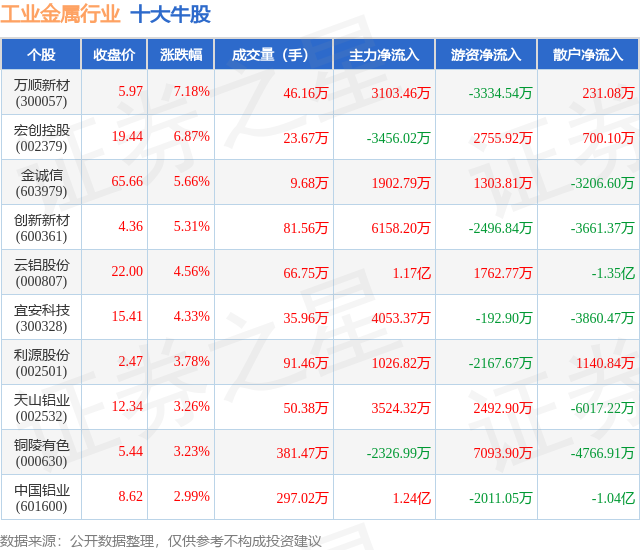 个股表现方面,工业金属行业当日领涨股为万顺新材(300057),该股当日报收5.97,上涨7.18%,成交量46.16万,主力资金净流入3103.46万元。宏创控股(002379)以上涨6.87%紧随其后,该股当日成交量23.67万,主力资金净流出3456.02万元。除此之外,金诚信(603979)、创新新材(600361)、云铝股份(000807)均进入当日牛股之列。具体个股列表见下表: