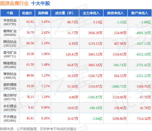个股表现方面,能源金属行业当日领涨股为华友钴业(603799),该股当日报收62.62,上涨3.45%,成交量88.73万,主力资金净流入3.13亿元。藏格矿业(000408)以上涨2.42%紧随其后,该股当日成交量11.77万,主力资金净流入3936.39万元。除此之外,腾远钴业(301219)、盛屯矿业(600711)、赣锋锂业(002460)均进入当日牛股之列。具体个股列表见下表: