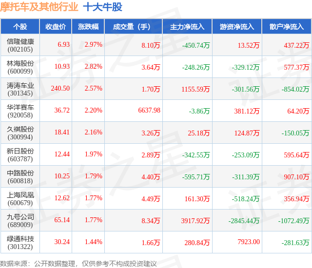 个股表现方面,摩托车及其他行业当日领涨股为信隆健康(002105),该股当日报收6.93,上涨2.97%,成交量8.1万,主力资金净流出450.74万元。林海股份(600099)以上涨2.82%紧随其后,该股当日成交量3.64万,主力资金净流出248.26万元。除此之外,涛涛车业(301345)、华洋赛车(920058)、久祺股份(300994)均进入当日牛股之列。具体个股列表见下表: