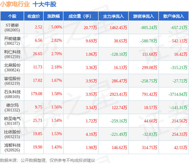 个股表现方面,小家电行业当日领涨股为ST德豪(002005),该股当日报收2.52,上涨5.0%,成交量20.77万,主力资金净流入1462.45万元。开能健康(300272)以上涨2.82%紧随其后,该股当日成交量9.69万,主力资金净流入38.65万元。除此之外,利仁科技(001259)、北鼎股份(300824)、富佳股份(603219)均进入当日牛股之列。具体个股列表见下表: