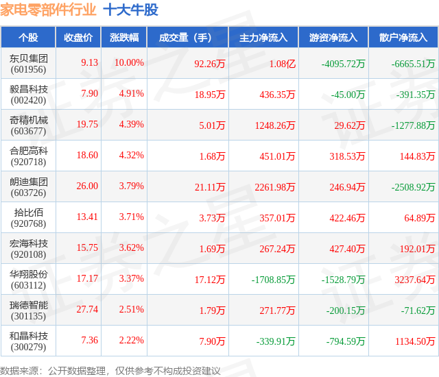 个股表现方面,家电零部件行业当日领涨股为东贝集团(601956),该股当日报收9.13,上涨10.0%,成交量92.26万,主力资金净流入1.08亿元。毅昌科技(002420)以上涨4.91%紧随其后,该股当日成交量18.95万,主力资金净流入436.35万元。除此之外,奇精机械(603677)、合肥高科(920718)、朗迪集团(603726)均进入当日牛股之列。具体个股列表见下表: