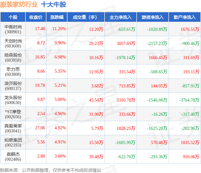 个股表现方面,服装家纺行业当日领涨股为中胤时尚(300901),该股当日报收17.48,上涨11.2%,成交量12.2万,主力资金净流出655.61万元。天创时尚(603608)以上涨9.96%紧随其后,该股当日成交量29.23万,主力资金净流入3057.69万元。除此之外,哈森股份(603958)、歌力思(603808)、浪莎股份(600137)均进入当日牛股之列。具体个股列表见下表: