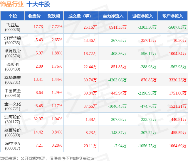 个股表现方面,饰品行业当日领涨股为飞亚达(000026),该股当日报收17.73,上涨7.72%,成交量25.16万,主力资金净流入8911.33万元。ST新华锦(600735)以上涨2.65%紧随其后,该股当日成交量43.46万,主力资金净流出267.65万元。除此之外,明牌珠宝(002574)、瑞贝卡(600439)、萃华珠宝(002731)均进入当日牛股之列。具体个股列表见下表: