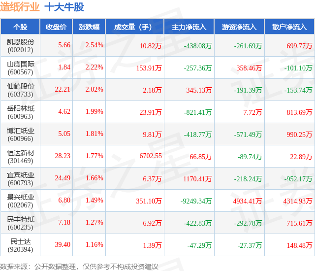 个股表现方面,造纸行业当日领涨股为凯恩股份(002012),该股当日报收5.66,上涨2.54%,成交量10.82万,主力资金净流出438.08万元。山鹰国际(600567)以上涨2.22%紧随其后,该股当日成交量153.91万,主力资金净流出257.36万元。除此之外,仙鹤股份(603733)、岳阳林纸(600963)、博汇纸业(600966)均进入当日牛股之列。具体个股列表见下表: