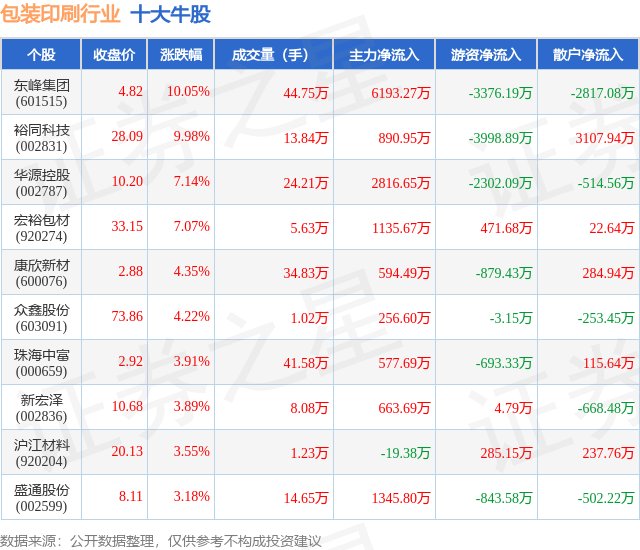个股表现方面,包装印刷行业当日领涨股为东峰集团(601515),该股当日报收4.82,上涨10.05%,成交量44.75万,主力资金净流入6193.27万元。裕同科技(002831)以上涨9.98%紧随其后,该股当日成交量13.84万,主力资金净流入890.95万元。除此之外,华源控股(002787)、宏裕包材(920274)、康欣新材(600076)均进入当日牛股之列。具体个股列表见下表: