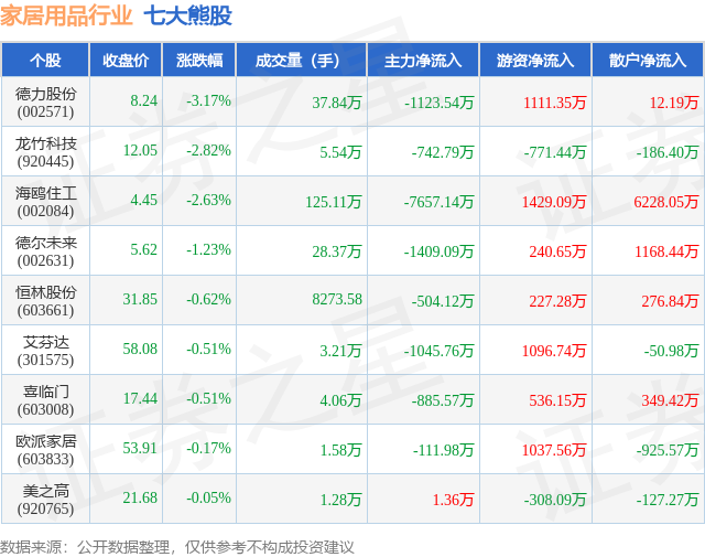 个股表现方面,家居用品行业当日领跌股为德力股份(002571),该股当日报收8.24,下跌3.17%,成交量37.84万,主力资金净流出1123.54万元。龙竹科技(920445)以下跌2.82%紧随其后,该股当日成交量5.54万,主力资金净流出742.79万元。除此之外,海鸥住工(002084)、德尔未来(002631)、恒林股份(603661)均进入当日熊股之列。具体个股列表见下表: