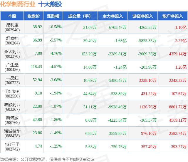 个股表现方面,化学制药行业当日领跌股为昂利康(002940),该股当日报收38.92,下跌6.58%,成交量21.07万,主力资金净流出6703.47万元。舒泰神(300204)以下跌5.57%紧随其后,该股当日成交量39.49万,主力资金净流出1.68亿元。除此之外,亚太药业(002370)、广生堂(300436)、一品红(300723)均进入当日熊股之列。具体个股列表见下表: