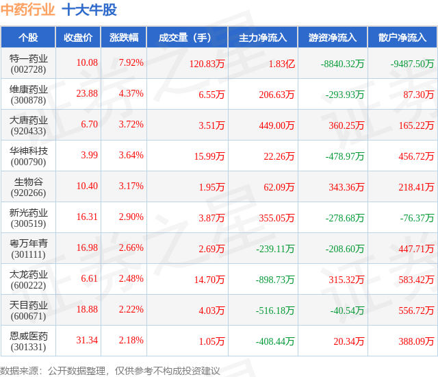 个股表现方面,中药行业当日领涨股为特一药业(002728),该股当日报收10.08,上涨7.92%,成交量120.83万,主力资金净流入1.83亿元。维康药业(300878)以上涨4.37%紧随其后,该股当日成交量6.55万,主力资金净流入206.63万元。除此之外,大唐药业(920433)、华神科技(000790)、生物谷(920266)均进入当日牛股之列。具体个股列表见下表: