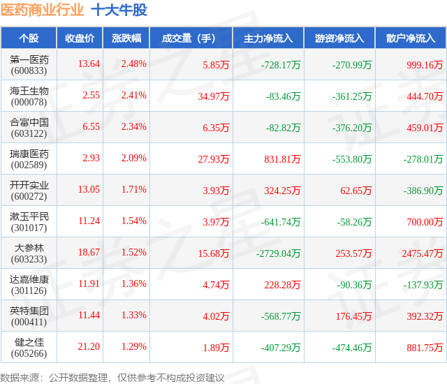 个股表现方面,医药商业行业当日领涨股为第一医药(600833),该股当日报收13.64,上涨2.48%,成交量5.85万,主力资金净流出728.17万元。海王生物(000078)以上涨2.41%紧随其后,该股当日成交量34.97万,主力资金净流出83.46万元。除此之外,合富中国(603122)、瑞康医药(002589)、开开实业(600272)均进入当日牛股之列。具体个股列表见下表: