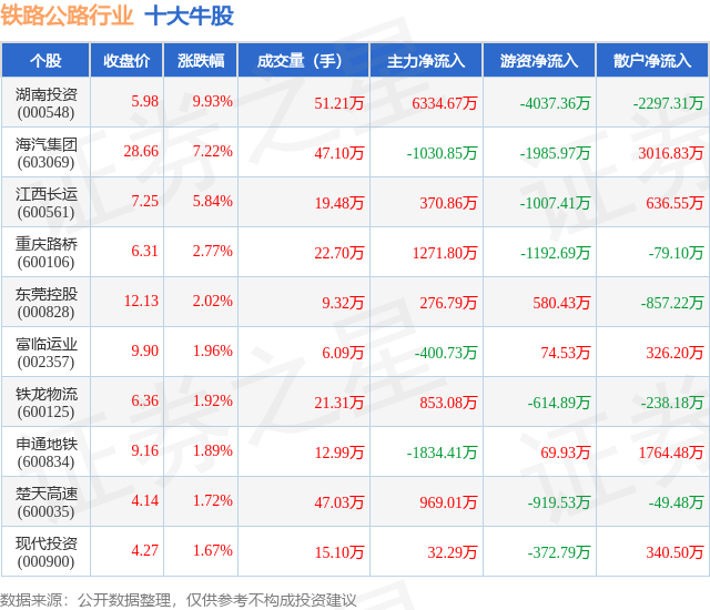 个股表现方面,铁路公路行业当日领涨股为湖南投资(000548),该股当日报收5.98,上涨9.93%,成交量51.21万,主力资金净流入6334.67万元。海汽集团(603069)以上涨7.22%紧随其后,该股当日成交量47.1万,主力资金净流出1030.85万元。除此之外,江西长运(600561)、重庆路桥(600106)、东莞控股(000828)均进入当日牛股之列。具体个股列表见下表: