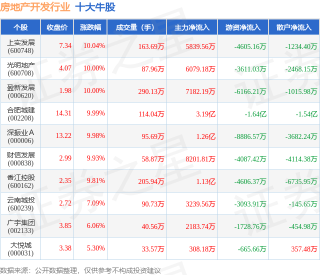个股表现方面,房地产开发行业当日领涨股为上实发展(600748),该股当日报收7.34,上涨10.04%,成交量163.69万,主力资金净流入5839.56万元。光明地产(600708)以上涨10.0%紧随其后,该股当日成交量87.96万,主力资金净流入6079.18万元。除此之外,盈新发展(000620)、合肥城建(002208)、深振业A(000006)均进入当日牛股之列。具体个股列表见下表:
