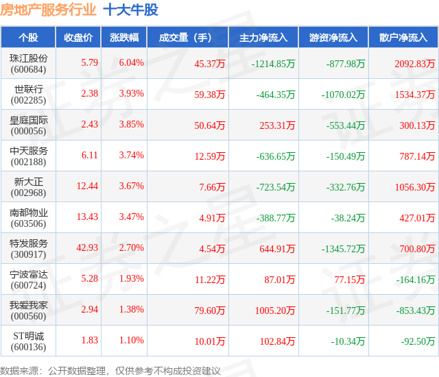 个股表现方面,房地产服务行业当日领涨股为珠江股份(600684),该股当日报收5.79,上涨6.04%,成交量45.37万,主力资金净流出1214.85万元。世联行(002285)以上涨3.93%紧随其后,该股当日成交量59.38万,主力资金净流出464.35万元。除此之外,皇庭国际(000056)、中天服务(002188)、新大正(002968)均进入当日牛股之列。具体个股列表见下表: