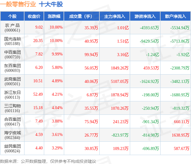 个股表现方面,一般零售行业当日领涨股为农 产 品(000061),该股当日报收9.02,上涨10.0%,成交量35.39万,主力资金净流入1.01亿元。国光连锁(605188)以上涨10.0%紧随其后,该股当日成交量40.95万,主力资金净流入1.51亿元。除此之外,中百集团(000759)、东百集团(600693)、武商集团(000501)均进入当日牛股之列。具体个股列表见下表: