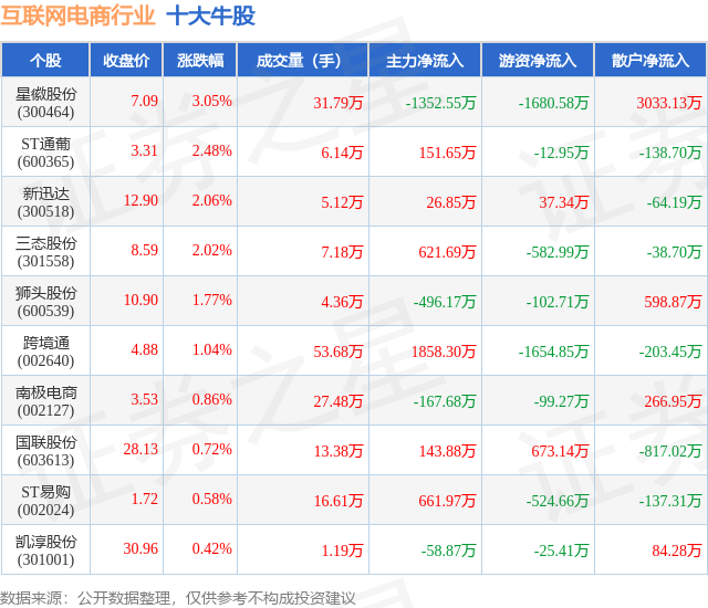 个股表现方面,互联网电商行业当日领涨股为星徽股份(300464),该股当日报收7.09,上涨3.05%,成交量31.79万,主力资金净流出1352.55万元。ST通葡(600365)以上涨2.48%紧随其后,该股当日成交量6.14万,主力资金净流入151.65万元。除此之外,新迅达(300518)、三态股份(301558)、狮头股份(600539)均进入当日牛股之列。具体个股列表见下表: