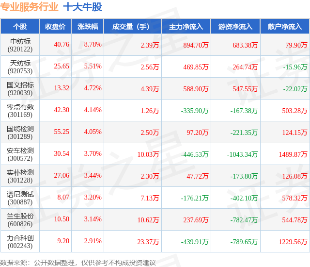 个股表现方面,专业服务行业当日领涨股为中纺标(920122),该股当日报收40.76,上涨8.78%,成交量2.39万,主力资金净流入894.7万元。天纺标(920753)以上涨5.51%紧随其后,该股当日成交量2.56万,主力资金净流入469.85万元。除此之外,国义招标(920039)、零点有数(301169)、国缆检测(301289)均进入当日牛股之列。具体个股列表见下表: