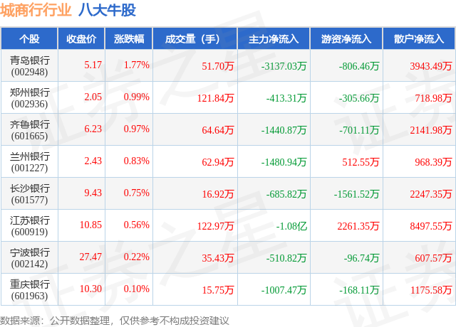 个股表现方面,城商行行业当日领涨股为青岛银行(002948),该股当日报收5.17,上涨1.77%,成交量51.7万,主力资金净流出3137.03万元。郑州银行(002936)以上涨0.99%紧随其后,该股当日成交量121.84万,主力资金净流出413.31万元。除此之外,齐鲁银行(601665)、兰州银行(001227)、长沙银行(601577)均进入当日牛股之列。具体个股列表见下表: